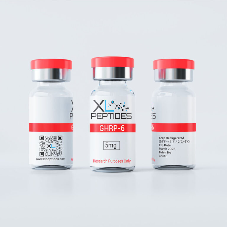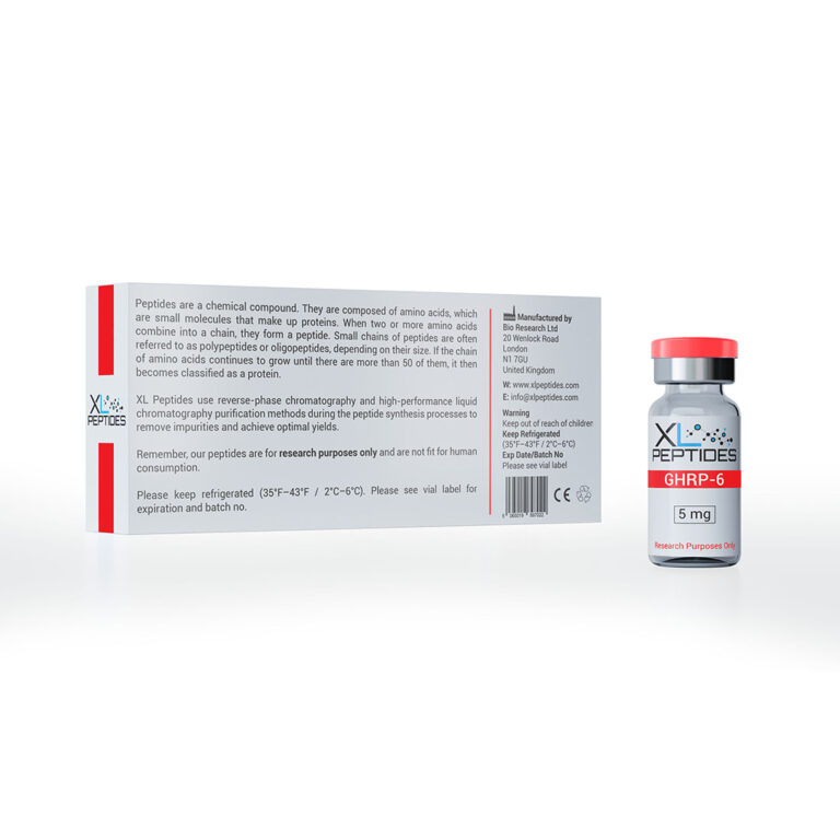 GHRP-6 also known as GHRP-Hexapeptide is a Growth-Hormone-Releasing-Peptide (GHRP) comprised of 6 amino acids. It is a powerful synthetic ghrelin mimetic. Dosed at 5 mg for research purposes.